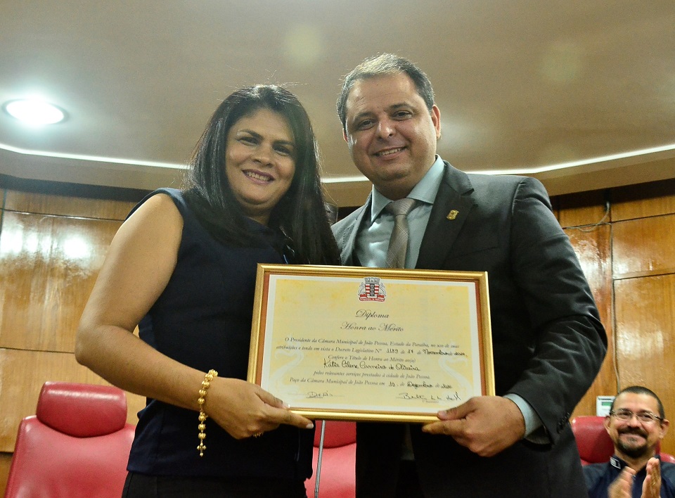 A Câmara Municipal de João Pessoa (CMJP) entregou, na tarde desta segunda-feira (19), o Diploma de Honra ao Mérito à professora Kátia Cilene Carneiro de Oliveira. O propositor da solenidade e da homenagem, vereador Marmuthe Cavalcanti (PSD), justificou a concessão da honraria à educadora devido ao seu extraordinário valor e aos relevantes trabalhos e serviços prestados à cidade de João Pessoa.